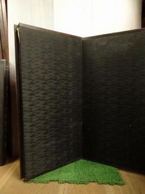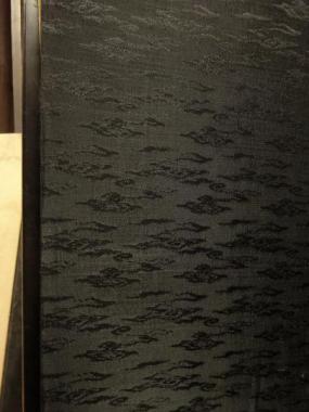 サイズは広げた時の寸法です。光沢感のある黒地の布に模様が入っています。紙の面は、日焼けや破れている箇所があります。