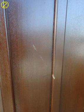 豆のような模様が入っていて、向こう側がみえにくいガラスが入っています。木材部分はつるつるとした質感でほこりや汚れが比較的付きづらく、お掃除しやすそうです。明かり窓の木枠は丸みを帯びており優しい印象です。