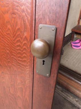 千葉県市川市の大正時代に建てられた古民家のものです。ドアノブもレトロなデザインです。木目がしっかり出ており味わいがあります。