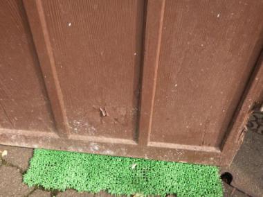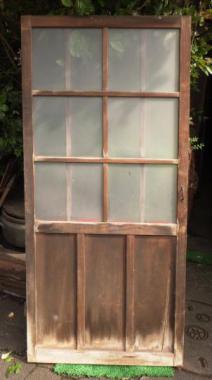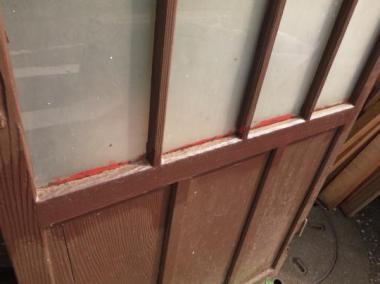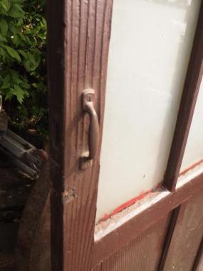 わけあり品。腰に割れがあるため。文京区のお宅で使われていたものです。曇りガラスが使われているので、向こう側が透けて見えません。レトロな味わい十分なドアです。