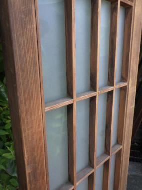 曇りガラスが二枚使われています。障子を想起させるシンプルなデザインで使い勝手がよさそうな横長の窓です。