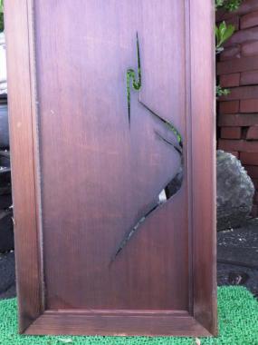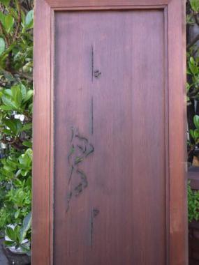 世田谷区の煙草屋兼曳家さんで使われていたものです。遠景の富士山が描かれています。限られたモチーフのみが彫られており、緊張感があります。