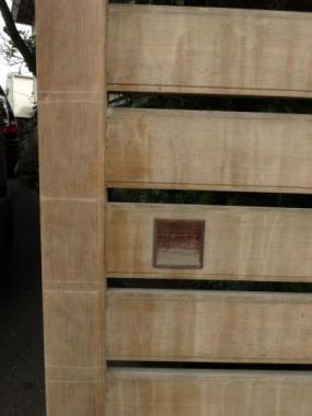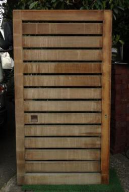 世田谷の民家で使われていたものです。針葉樹の独特の目の詰まった素材感とぎゅっと背を縮めたようなサイズ感がマッチしています。横桟のデザインですと、洋風のイメージも漂いますが、こちらの格子戸は引手意匠をふくめ和風の印象が強いです。