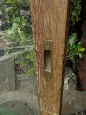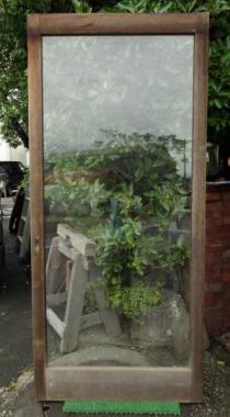 比較的背が高い戸になります。大きな一枚ガラス戸(透明)が入っていますので、設置したときに開放感があると思います。ガラスがヨレており、工業製品では出ない面白みがあります。縦框は65mmです。