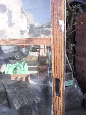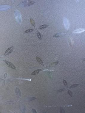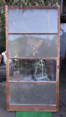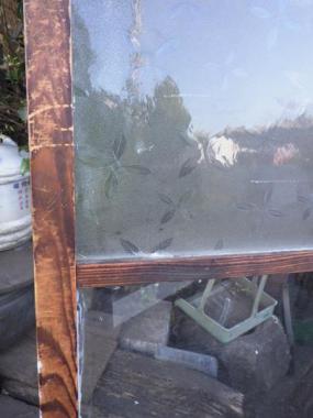 わけあり品。片面ペンキ塗装されているため。4枚のガラスのうち3枚は葉っぱの模様になっています。最近では見かけないどこかほっとするデザインです。文京区根津で使われていたガラス戸です。