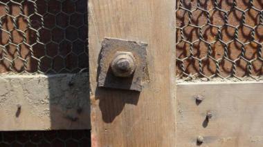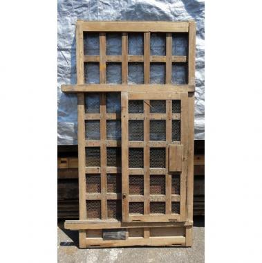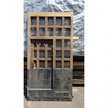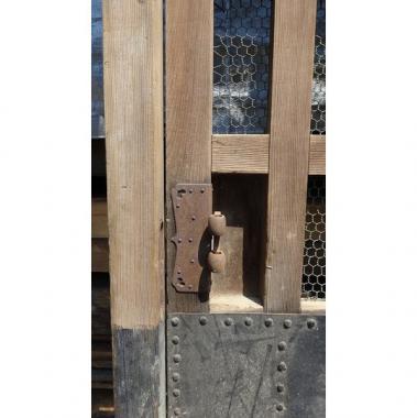 カラマツ材を使った蔵戸です。現状では、潜り戸の部分がボルトで固定されている状態です。 高さ1,975mm幅1,025mm厚み60mmです。 詳細お問い合わせください。