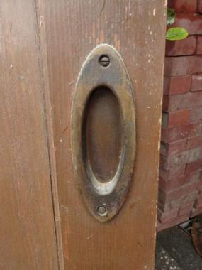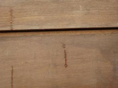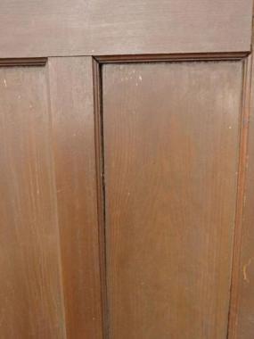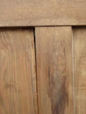 表面が茶色のペンキ塗装になっています。裏面はシオジ材の自然な風合いです。数か所すきまができています。
