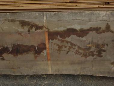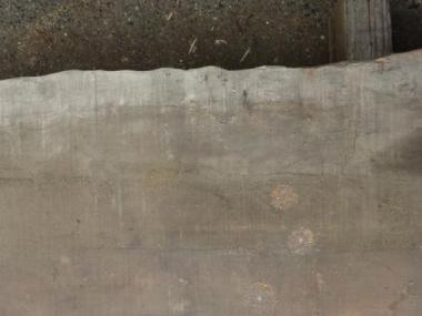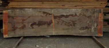 現状色がくすんでしまっていますが、もともとの素材は明るい色味です。裏面の写真の一部、色の明るい部分が参考になるかと思います。幅の木表寸法は、末口800mm、中間750mm、元口820mmです。