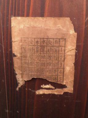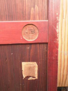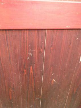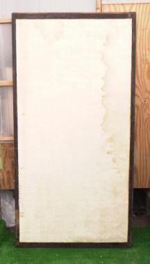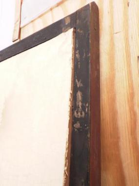 わけあり品。襖面にシミ、枠に難あり。板に隙間、引き手の金具が外れてむき出しになっているため。明治時代とも受け取れる授業科目が並ぶ時間割表が貼り付けられています。時代を超えてきたからこその面白さが宿る希少な建具と言えそうです。