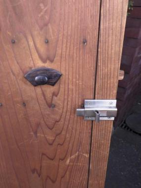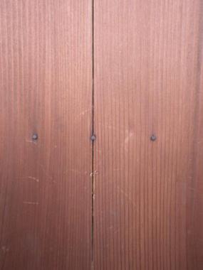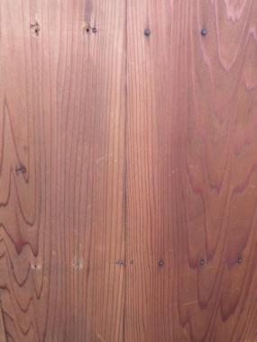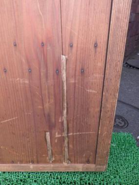 わけあり品。板に割れがあるため。扇型の取っ手の近くに新しめの鍵が取り付けられています。