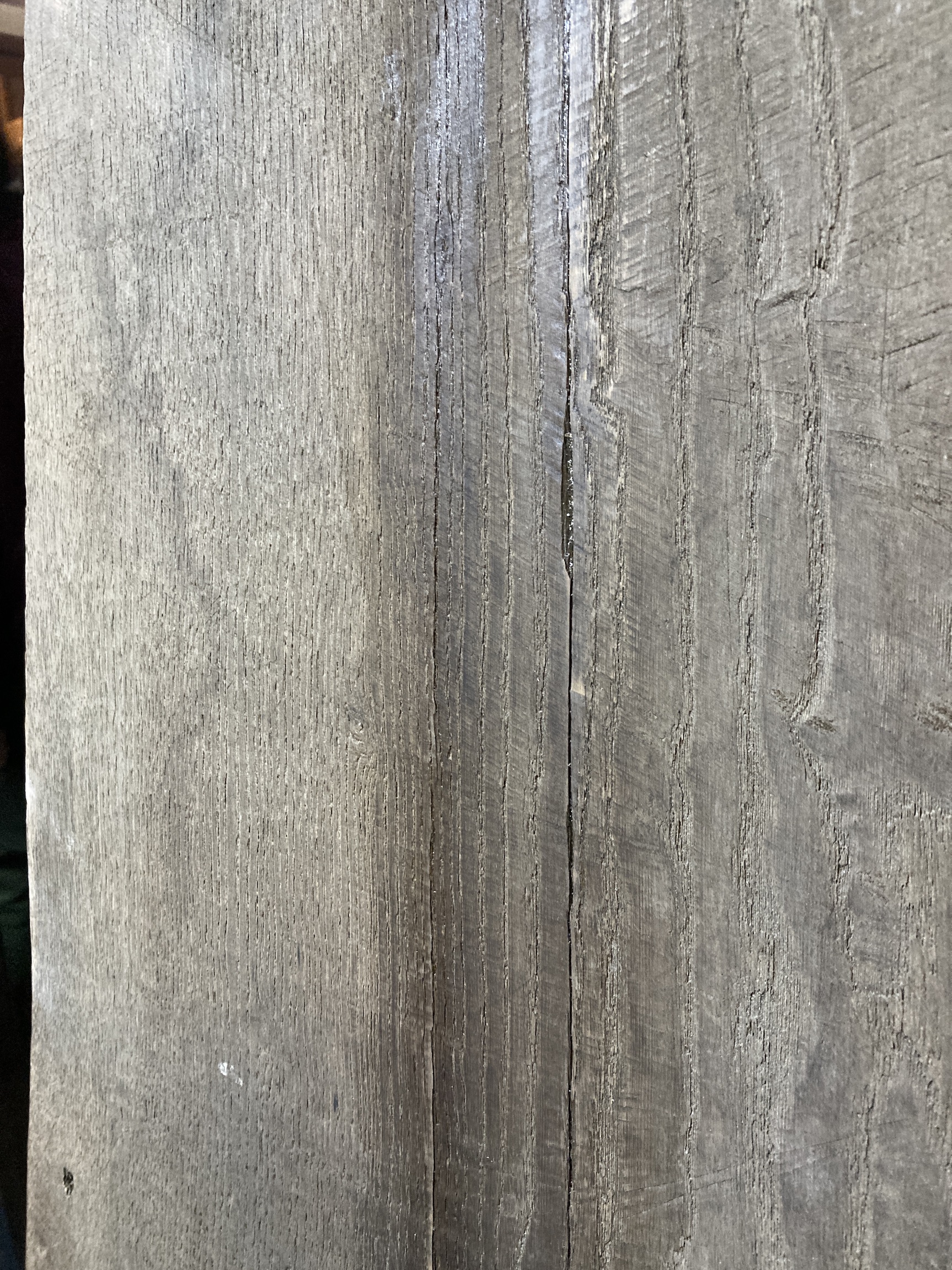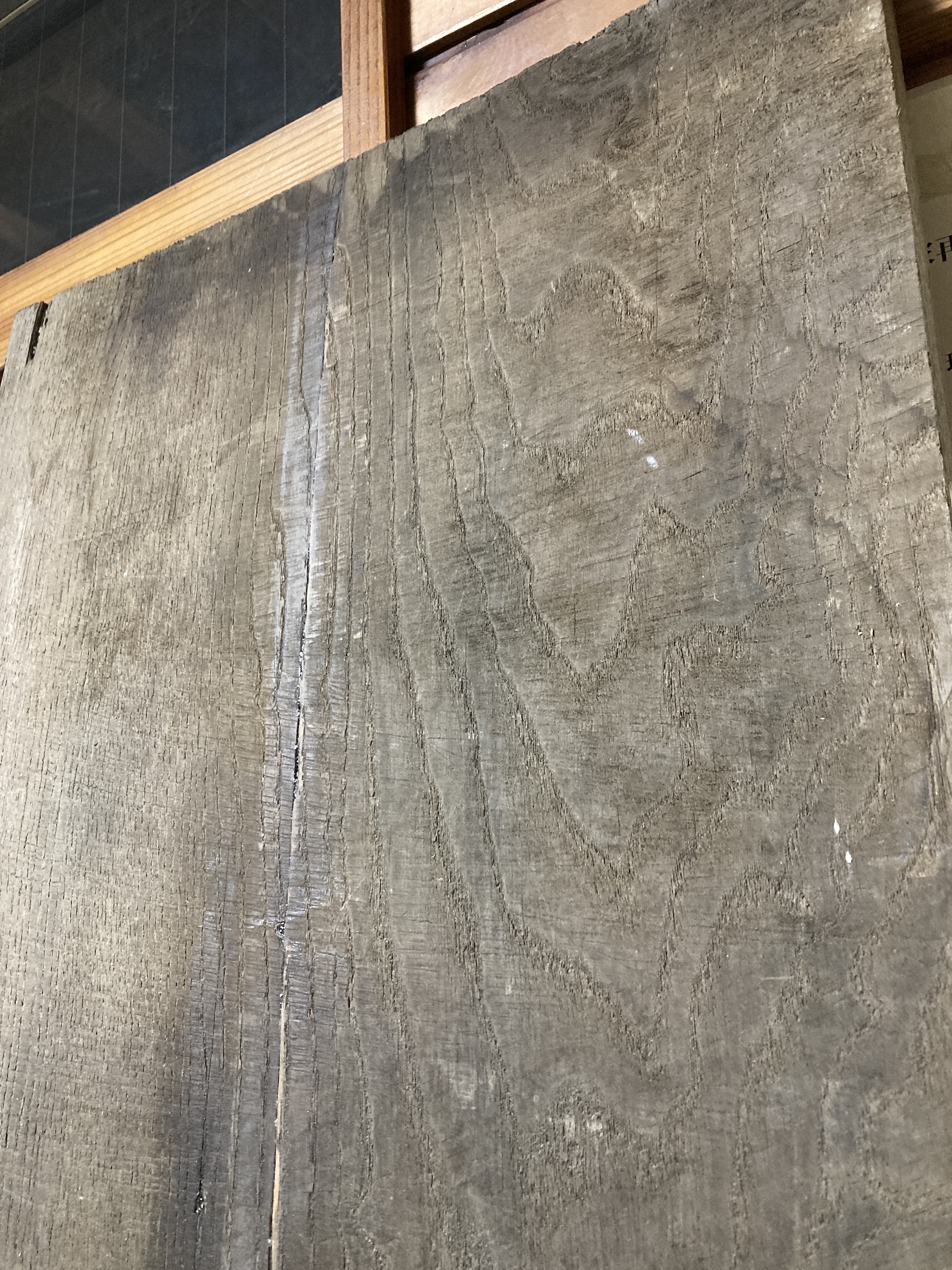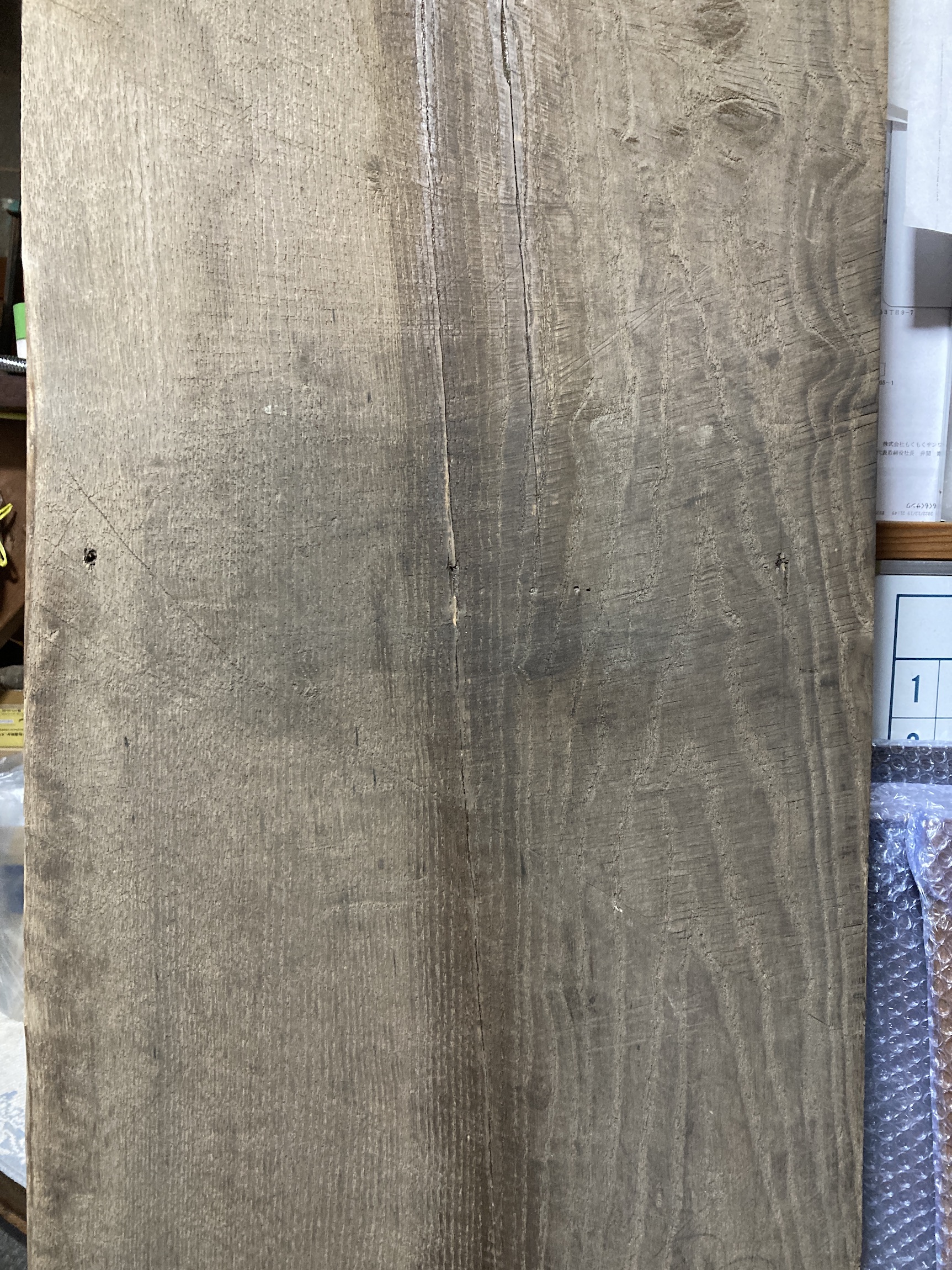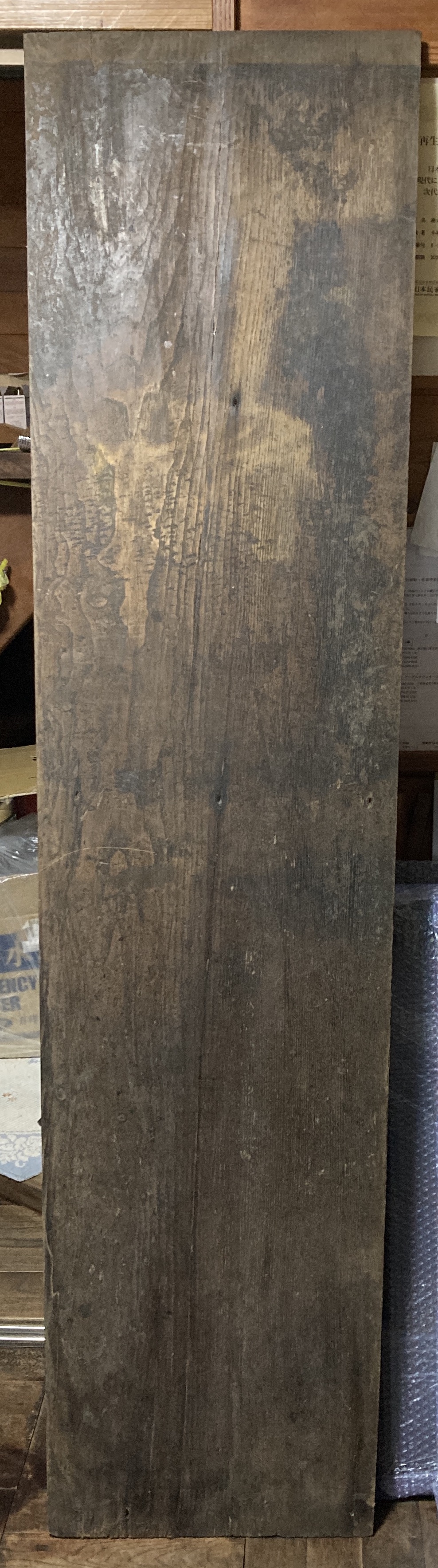 経年変化による自然な色味が楽しめるケンポウナシの古材板です。新材には出せない味わいがあります。割れがあったため補修しています。