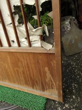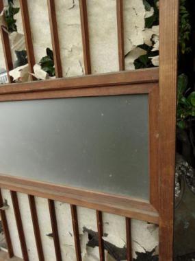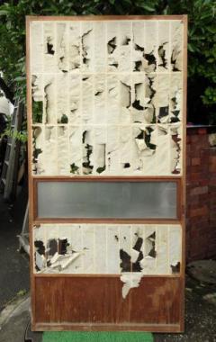 現状、和紙がべりべりですが、張り替えれば問題なくご使用いただけます。曇りガラスの横額入りですので、和紙とのコントラストなど、灯りをつけた時に楽しめそうな一枚。縦框27mmです。
