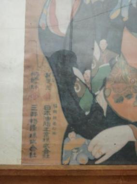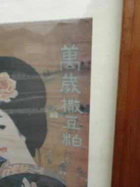 萬歳撒豆粕(バンザイバラマメカス)という文字が入っています。神戸周辺の輸入業者が取り扱っていた肥料の名前のようです。背景には確かに農作業の風景が。三井物産の文字も確認できます。色褪せの効果も重なりレトロ感充分なポスターです。額付きです。