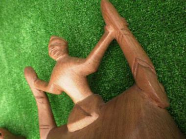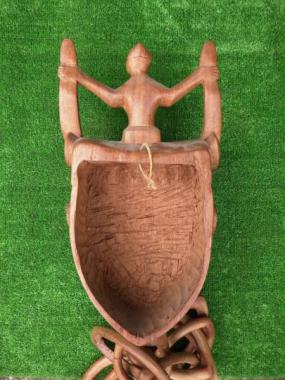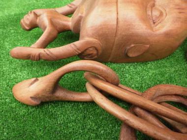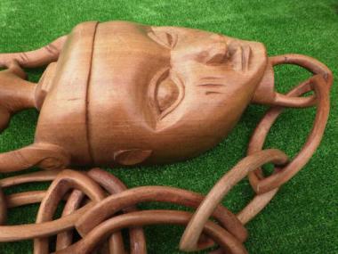 頭に妖精のようなものがついたチャーミングな民芸品です。吊り下げて飾ることができます。木目も木の色も美しい素材が使われています。サイズは頭部のみの大きさです。鎖を足すと全長1150mmほどになります。