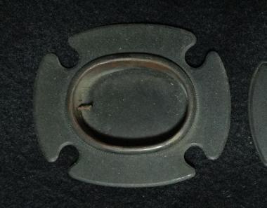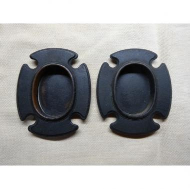 四角が円形でくり貫かれたつくりです。楕円形の引き手と比べると、アクセントがあります。 在庫のうち1つは外周のデザインが二重ではないものになります。 詳細は写真をご覧ください。 サイズは、高さ83mm幅75mm厚み10mmです。 詳細は、お問い合わせください。