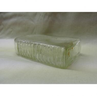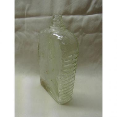 タバコの箱ぐらいの大きさ、不思議な形の小さなビン。口の形から推測すると、オーデコロンが入っていたかもしれません。 洗濯板のような側面のでこぼこ、ガラスの微かな歪み 見ていても、触っていても、飽きがこない一品。 高さ112mm幅55mm厚み20mmです。