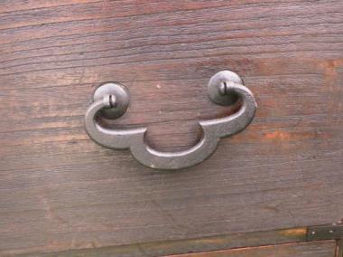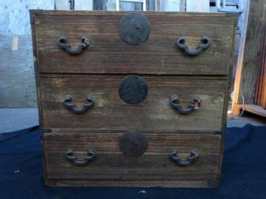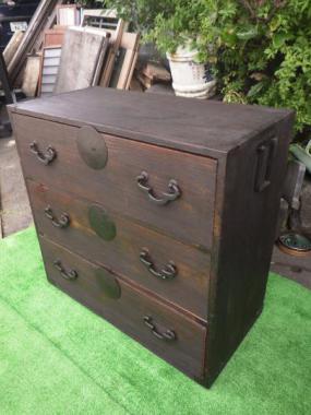 中央の鍵穴のかたちがレトロ感を彷彿とさせます。使い勝手のよい三段の引き出し。引手や鍵の金具が大振りでどしっと構えた頼もしい表情。それでいて質素な雰囲気なので普段の生活にそっと馴染んでくれそうな和箪笥です。材は桐です。塗料は「春風」の「ココナツ」というものを使用しています。塗料の詳細はこちらhttp://www.sanyu-paint.co.jp/product/sp_harukaze
