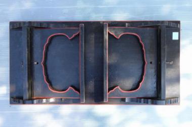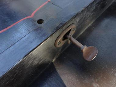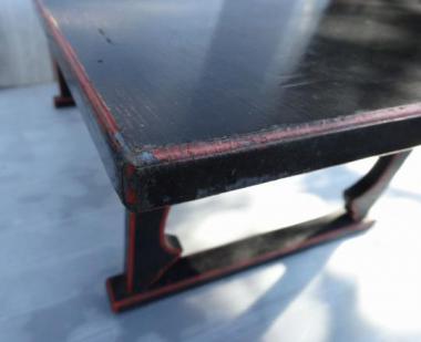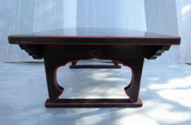 鍵で足を留めるタイプの文机です。淵に施された装飾はどこか優美で落ち着いた雰囲気。姿勢を正して、字を書きたくなるようなそんな机です。