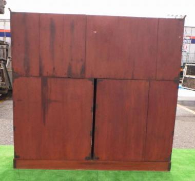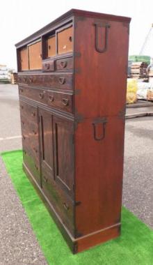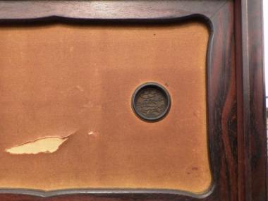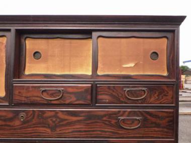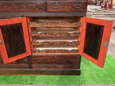 黒檀の木目が全体の印象を引き締めます。引き手に凝った模様が描かれていたり、内側にきらびやかな木材が使われていたり、細やかなところにこだわりが感じられます。家具屋さんがご自宅で大切に使われていたもので随所に魅力的なディテールがあります。