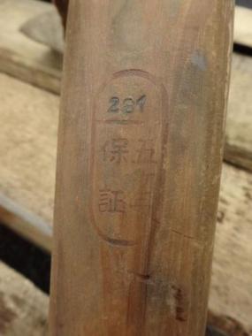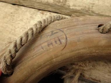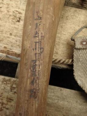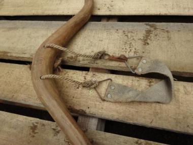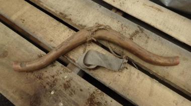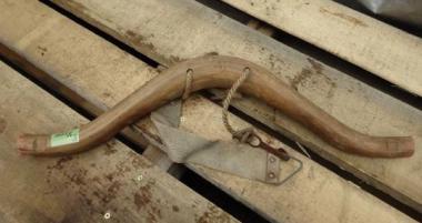 大変ユニークなかたちの農具です。牛の後頭部にこれを下げ、農耕具を引っかけて畑を耕していたのだと思います。一見ハンガーにも見える、不思議な形をしています。木材の曲げ加工の技術も見どころです。