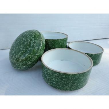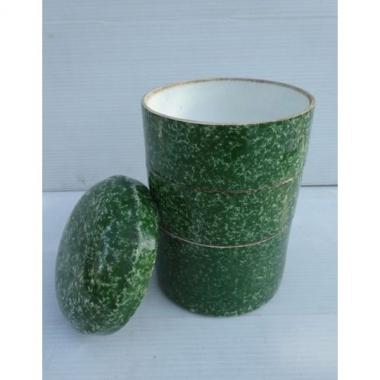 陶器製の翠色のいれもの。三段重ねたかたちです。調べたところ、どうやらお弁当箱のような役割をしていたお品のようです。内側も大きな欠けは見当たりません。一つずつ入れ物として使っても、ショーケースとして何かを入れても良いと思います。高さ205mm直径120〜125mmです。詳細お問い合わせください。