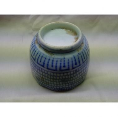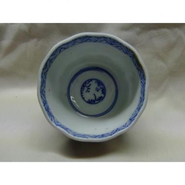 青い模様が愛らしい、そば猪口です。 ふちのところが真丸ではなく、かくかくとしており、特徴があります。 模様もかたちも規則的ではなく、独特のリズムを持った一品です。 高さ55mm直径70mmです。