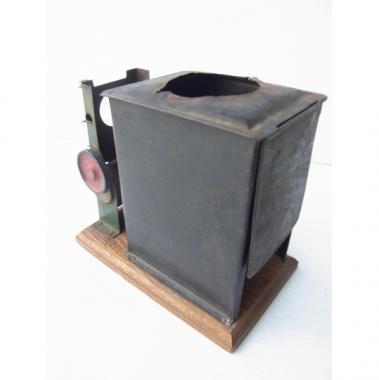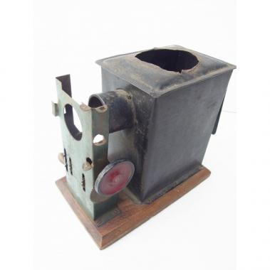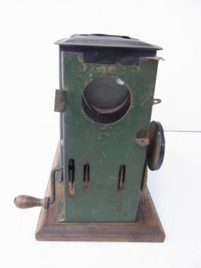戦後のものと思われます。古い映写機です。赤、緑、黒の三色使いがなんともレトロです。 ハンドルも回ります。 高さ160mm幅185mm奥行き115mmです。 詳細お問い合わせください。