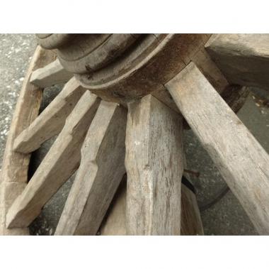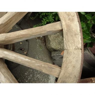 樫の木材で作られているようです。材木と材木をどのように組み合わせているかに、 注目してみてみるとなかなか味わい深いです。 お店でディスプレイされていた品物です。 自立させるための台座もお付けしております。 直径1,050mm車輪の厚み43mm中央部の厚み430mmです。 詳細お問わせください。