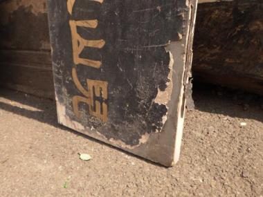 わけあり品。角や端のほうが剥がれてきているため。お手頃価格の看板です。レトロな雰囲気が演出できそうです。