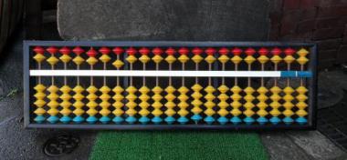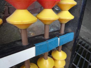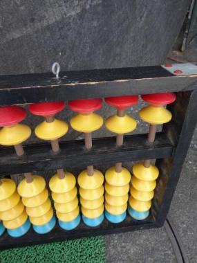大変ポップな色使いのそろばんです。大きなサイズですので、授業用のものかもしれません。 つりさげるための金具が二つのうち、一つ無いです。