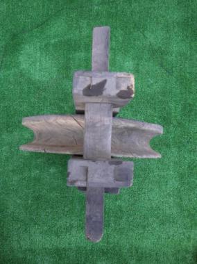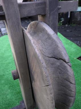 井戸の上のところにある滑車です。長く時間を経たことにより乾燥し、独特の亀裂が車の部分に見られ、味わい深いです。