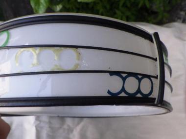 わけあり品。装飾に傷みがあるため。緑、黄、青の三連丸型が音符のように並んでいます。五線譜のように入った金具も緩やかに歪みどこか親しみやすい表情です。