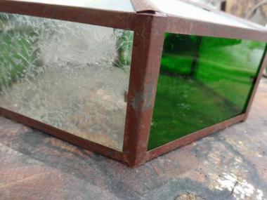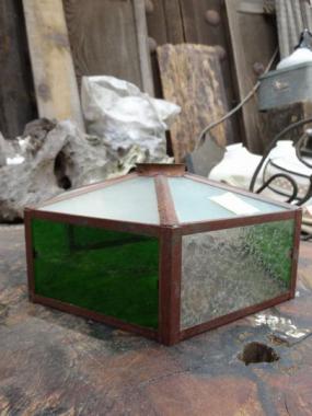 三種類のガラスが使われております。緑のガラスを通した光と繊細なガラスの印象に心なごみそうな魅力的な照明です。