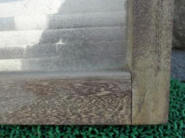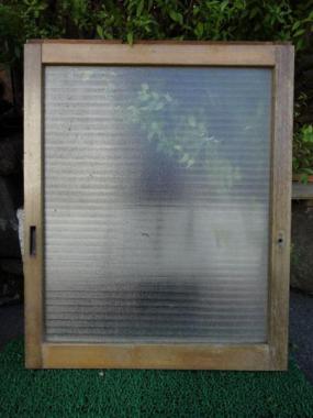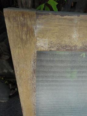 日焼けなどによる色のむらが良い味わいです。そのまま使うのも魅力的です。針葉樹の木目が素朴な印象です。柿渋などで塗装しなおしても素敵に仕上がりそうです。梨地のモールガラスがつかわれています。