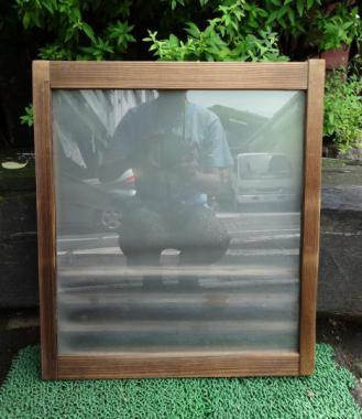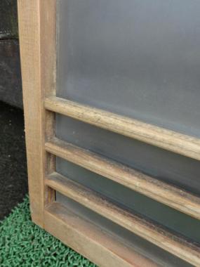 足立区のたばこ屋さんで使われていたどこか懐かしい雰囲気のガラス窓です。曇りガラスにシンプルな三本の線があしらわれており、落ち着きのあるデザインです。
