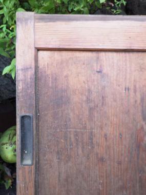 木材特有のくすみが渋い風合いの一品。引き手も古めかしくて面白いです。在庫2点それぞれ幅と高さに5mm程度の寸法のずれがあります。