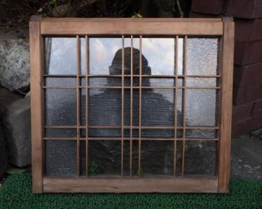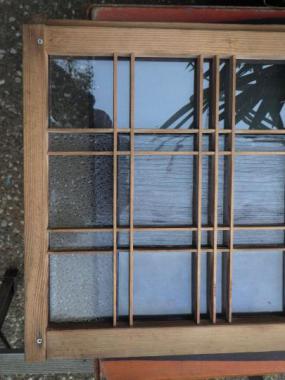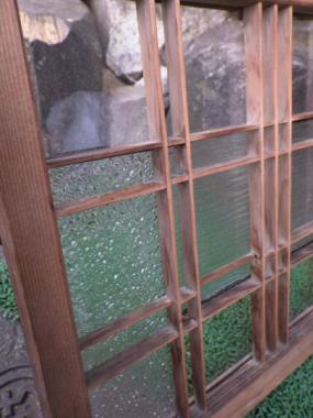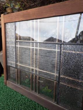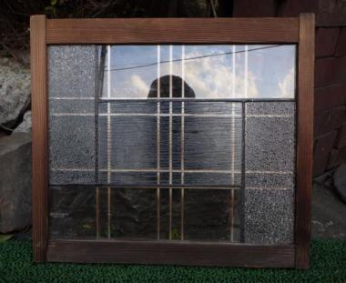 三種類のガラスが繊細にレイアウトされています。透明なので遠目には気づかないささやかな演出。近くでみると大変魅力的です。それぞれのガラスの光り方に注目したくなる素敵な窓です。在庫2点のうち1点は枠のところにネジで固定している個所があります。