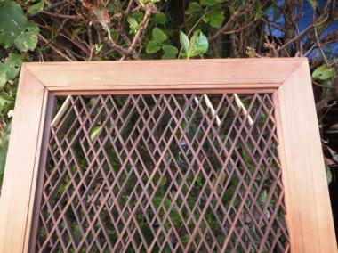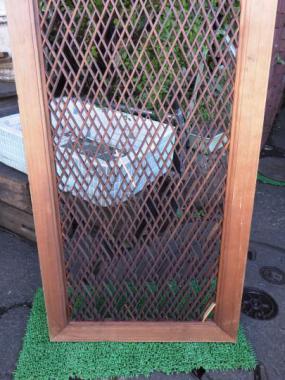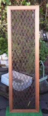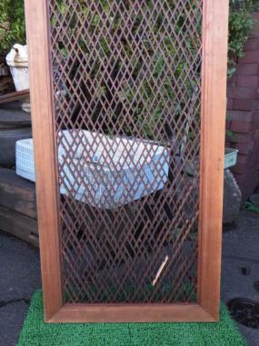わけあり品。補修跡があり、欠けている箇所もあるため。埼玉県所沢市の民家で使われていたものです。比較的大きい欄間で細かい格子模様が入っているので見応えがあります。
