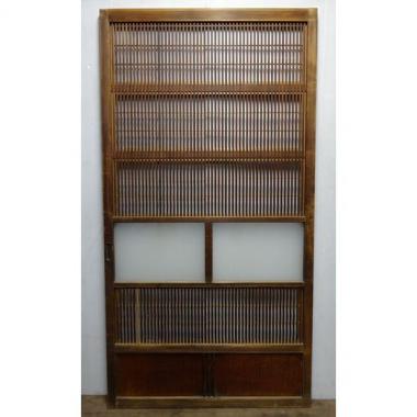 スギと堅木がメインに使われています。面白みのある腰材の模様と、クロガキの装飾が一風変わった雰囲気を演出します。 ニカワとすりガラスの2種のガラスが使われています。 高さ1,748mm幅930mm厚み32mmです。 詳細お問い合わせください。
