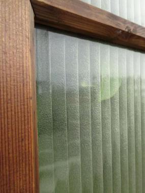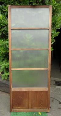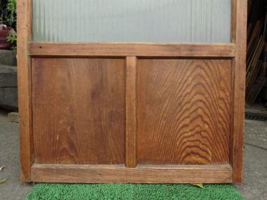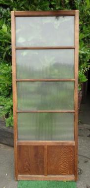 葛飾区の民家で使われていたものです。腰の真ん中の木材は面取りしてあり、上品な印象です。梨地に縦縞のモールガラスが使われており、透明ガラスとは一味違った表情を楽しめます。