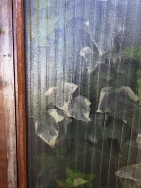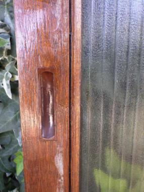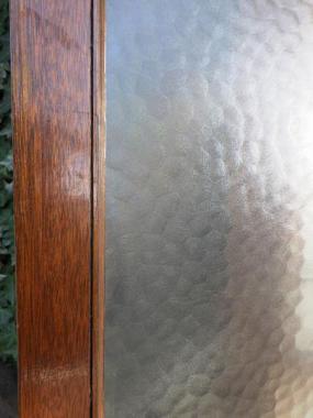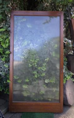 梨地に縦モールの柄が入ったガラス戸です。どこか懐かしい表情があります。在庫それぞれ使われているガラスがことなります。もう一点は、梨地にウロコ模様のガラスになります。