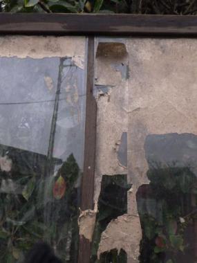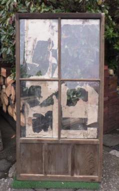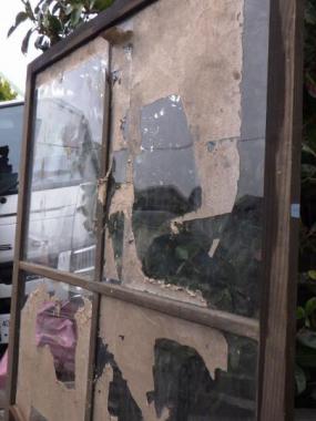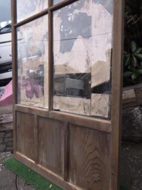 わけあり品。おさえの棒が破損しており、ガラスが割れてしまっています。ガラスは透明ガラスです。窓枠が大きく開放感のある戸です。