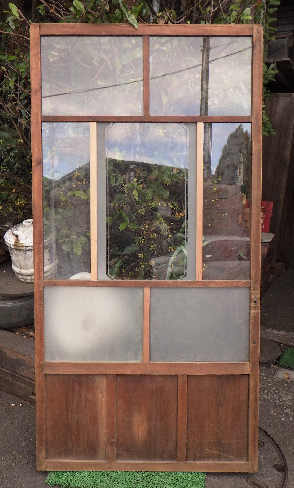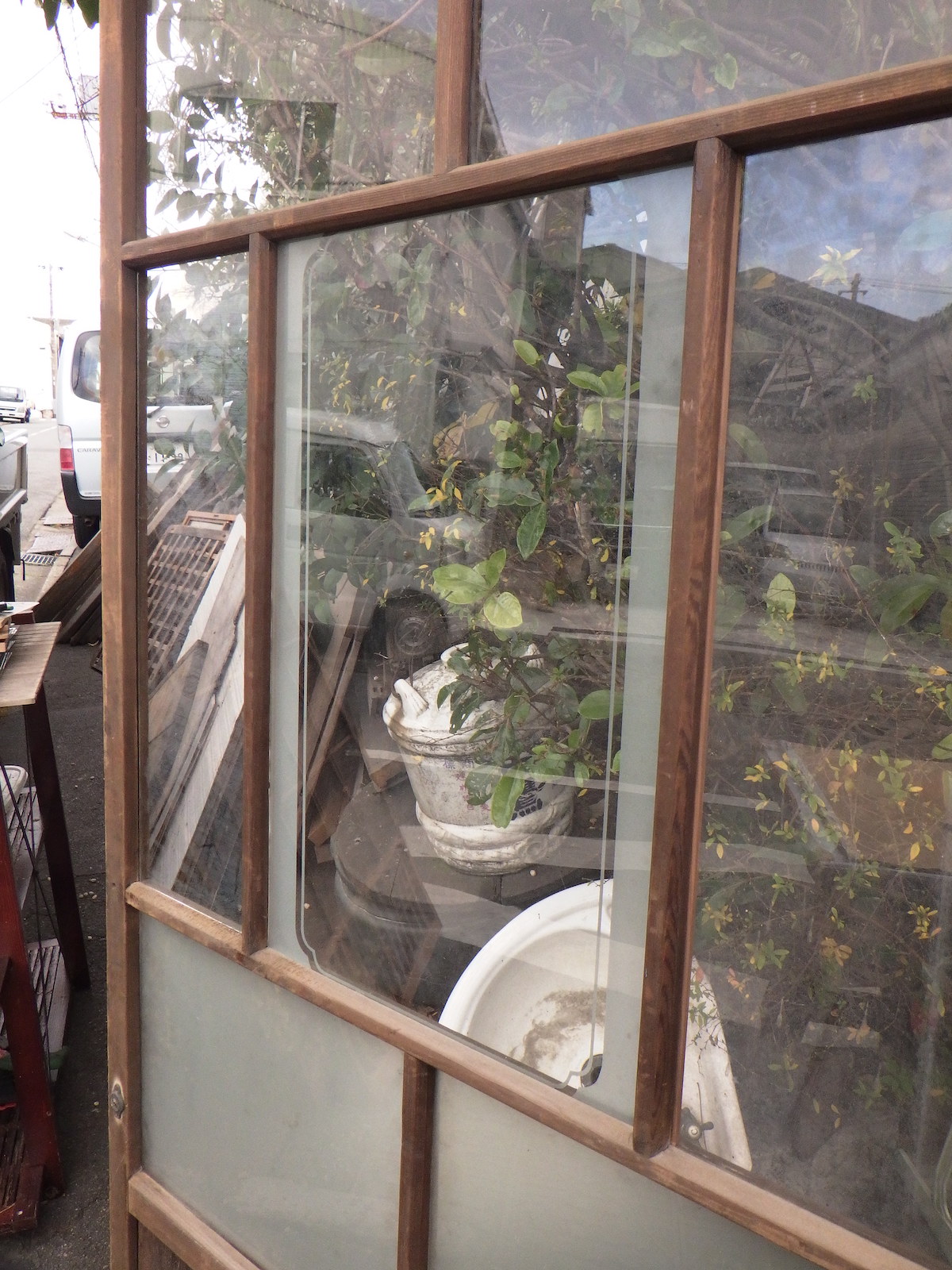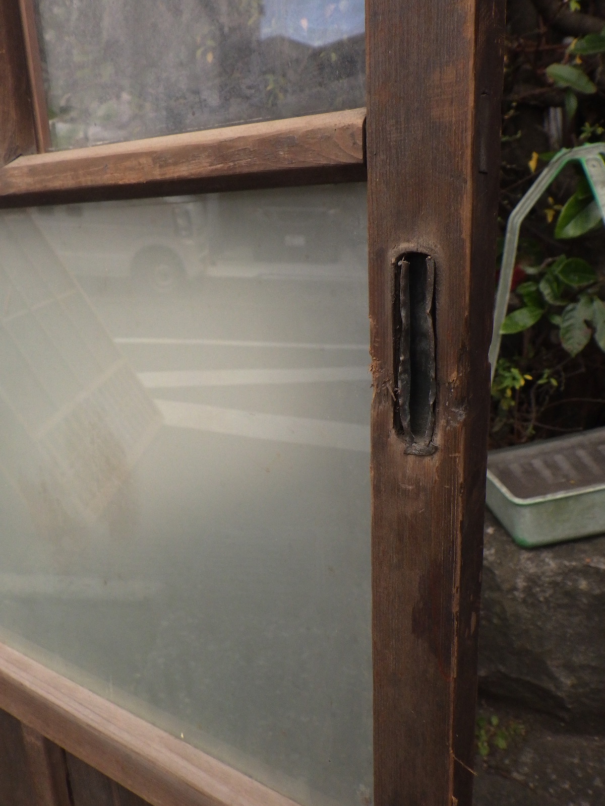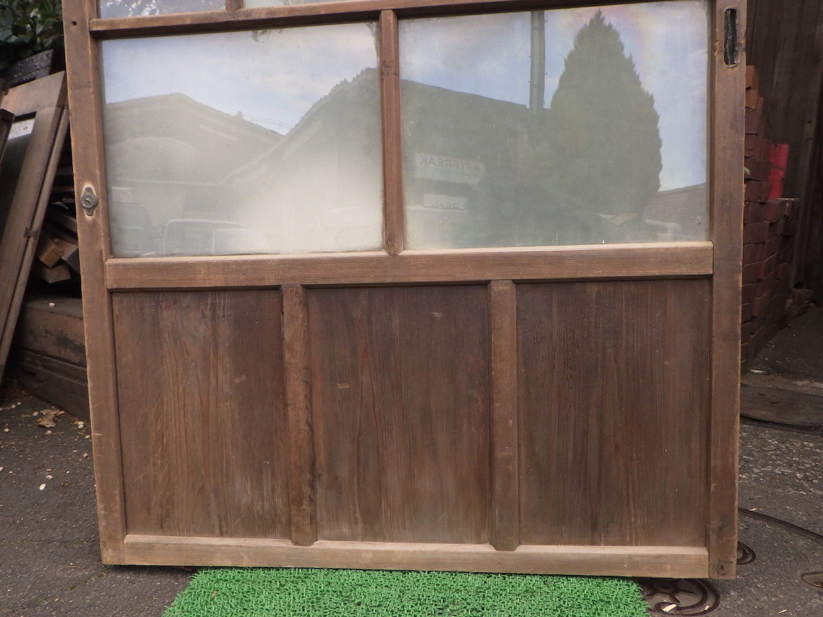 わけあり品。墨田区向島の民家で使われていた古いガラス戸です。腰に傷み、桟や框に粘着剤の跡があります。
