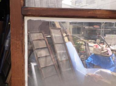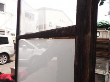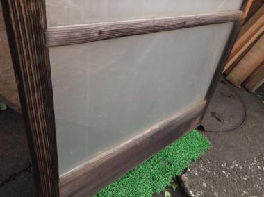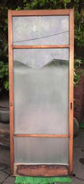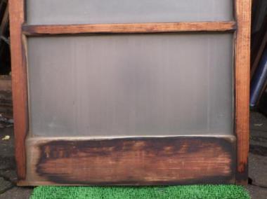 わけあり品。ガラスに隙間や、粘着剤の跡があるため。要修理品です。文京区のお宅で使われていたものです。ガラスは下段曇りガラス、中段グラデーション、上段透明ガラスです。在庫のうち一点のみ、隙間も粘着剤跡もないものがございます。