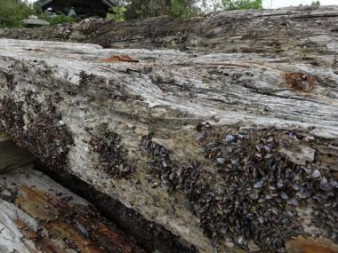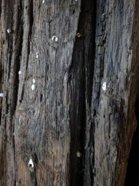 貝が付着したりして、木目とはまた違う表情が出ていて面白いです。同色系の貝、もしくは暗めの木に白い貝などいろいろな種類があります。貝があまり付いていないものもあります。独特のおうとつ、貝の形状などライティングを工夫すると不思議なディテールが浮かび上がりそうです。自然物ですので寸法など多少の個体差があります。