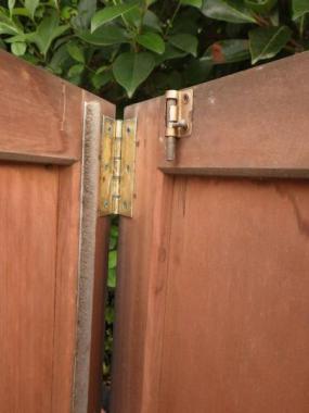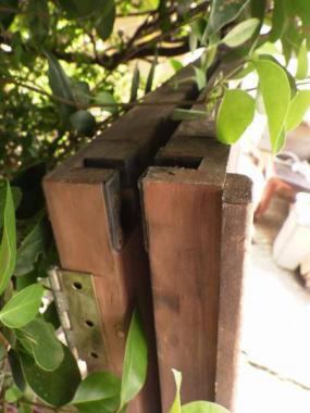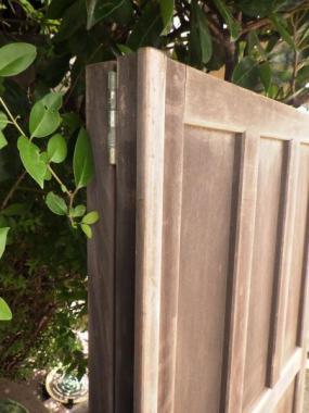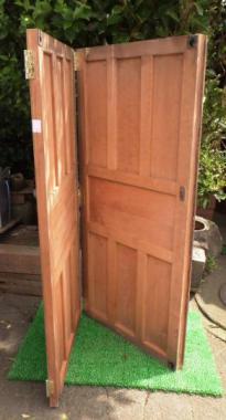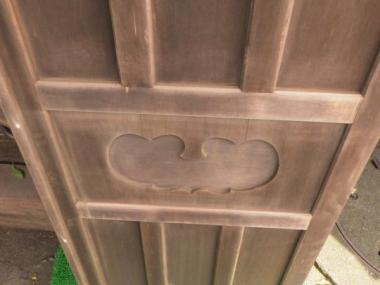 現状は2枚一組の両折の状態になっています。サイズは一枚で計測したものを掲載しています。組で購入される場合は20,000(税抜)円となります。丁番つなぎの戸を折ることによって開けるタイプの建具でお寺で見かけるようなデザインです。帯のところにシンプルながら魅力的な装飾も付いています。