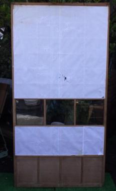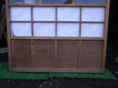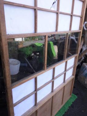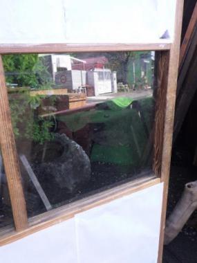 在庫のうちガラスがないものがございます。固定すれば問題ないかもしれませんが、現状多少がたつきがございます。詳細お問い合わせください。世田谷区の煙草屋兼曳家さんで使われていたものです。格子部分の木目の模様が虎柄のようにもみえ、なかなか素敵です。