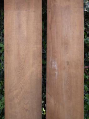 厚さ7mmほどの扱いやすい板です。材質は杉です。経年変化によって木目の間がすいて凸凹に浮き上がっています。価格は一枚あたりの値段になります。