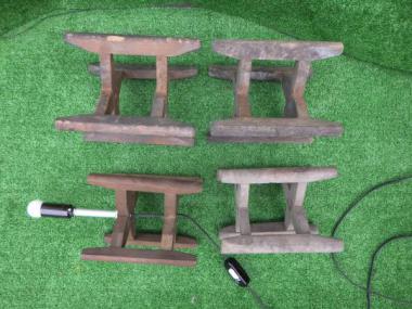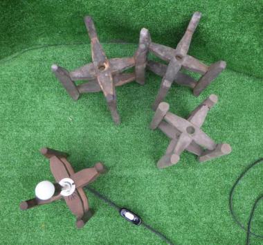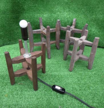 縦にしても横にしても十字に固定されています。上にお盆のようなものをのせると、小さな台にもみえてきます。 寸法は以下の通りです。 手前左70×175(直径) 手前右185×175(直径) 左奥205×200(直径) 右奥195×195(直径)です。 手前左にある電球付のみ2,000円(税抜)です。 こちらは筒状の和紙等を被せることで行燈風になります。