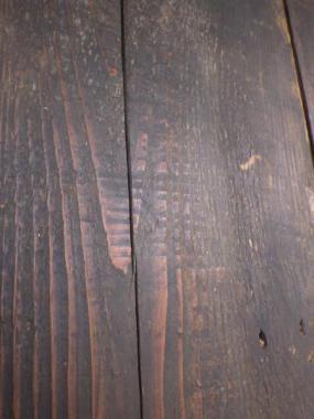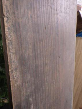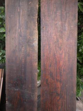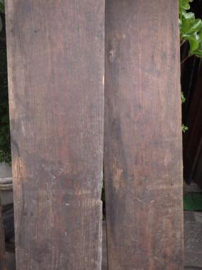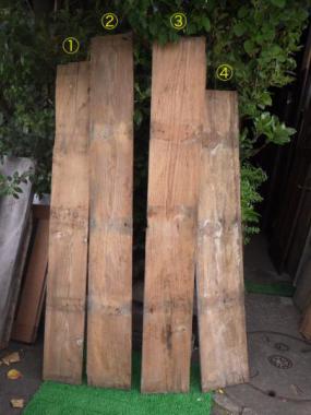 のこぎりではつった跡が残っています。機械で削った跡と違い一点ずつそれぞれに味わいが異なります。経年変化により、板の状態は平らでなく、歪みがあります。①②はお掃除後にアマニ油を塗りました。③④は水拭きのみの状態で、こちらは5,000円(税抜)となります。それぞれ寸法が異なります。 ①1740×230×11 ②1780×220×10 ③1700×250×13 ④1600×290×15 こちらの在庫の他にお掃除、お手入れ前の在庫が50枚程ございます。多数購入をご検討の方はご相談ください。